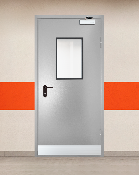 Сертифицированная однопольная противопожарная дверь EI 45 в серой исполнении предназначена для обеспечения безопасности эвакуационных путей.