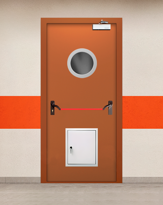 Профессиональная противопожарная однопольная дверь класса EIW 60 с коричневой отделкой обеспечивает надежную защиту от огня и дыма.
