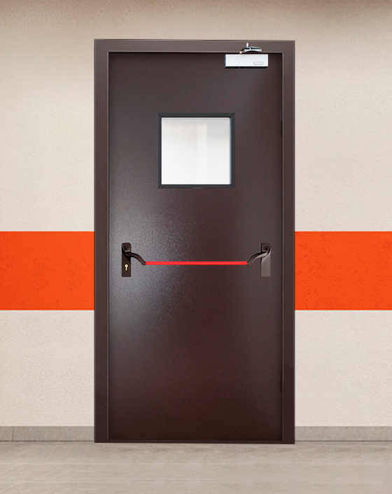 Специализированная однопольная дверь противопожарного назначения класса EIWS 45 в коричневой цветовом решении.