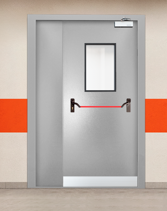 Специализированная полуторная дверь противопожарного назначения класса EI 30 в серой цветовом решении.
