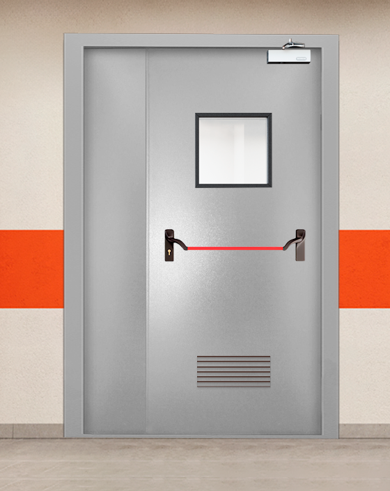 Специализированная полуторная дверь противопожарного назначения класса EI 30 в серой цветовом решении.