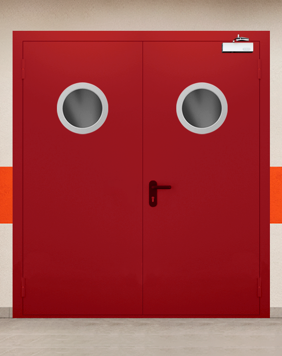 Специализированная полуторная дверь противопожарного назначения класса EI 30 в красной цветовом решении.
