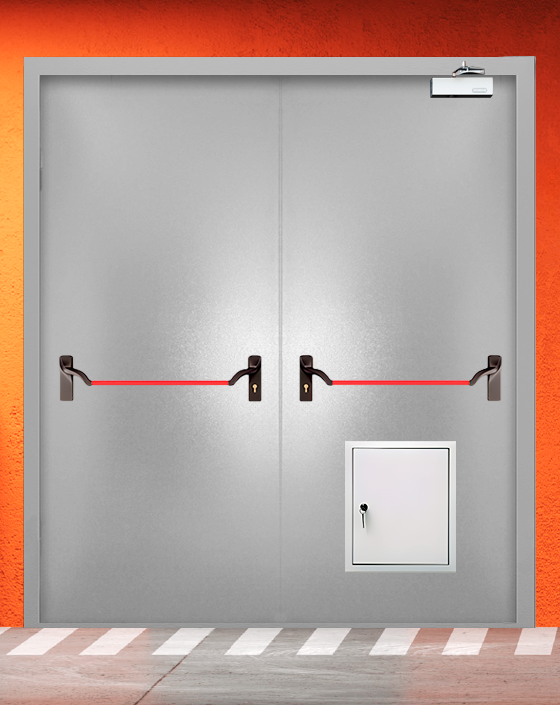 Специализированная полуторная дверь противопожарного назначения класса EIS 30 в серой цветовом решении.