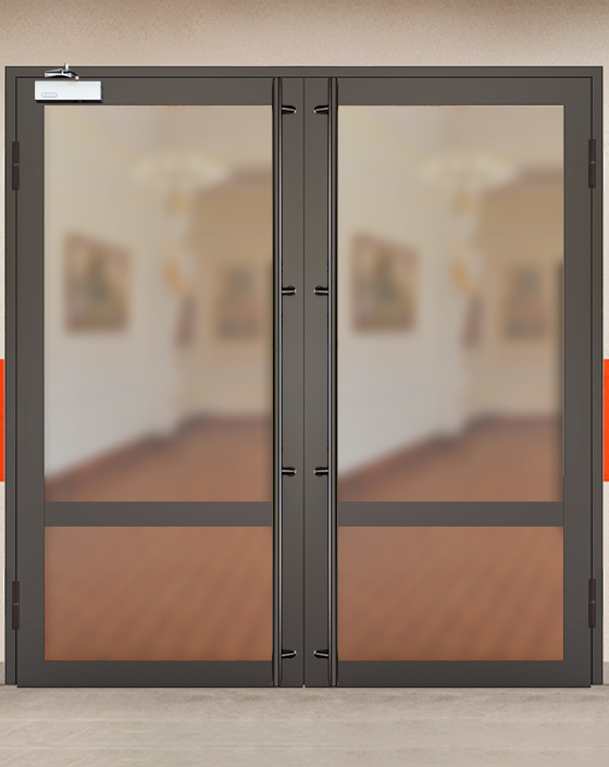 Профессиональная противопожарная полуторная дверь класса EIW 60 с коричневой отделкой обеспечивает надежную защиту от огня и дыма.