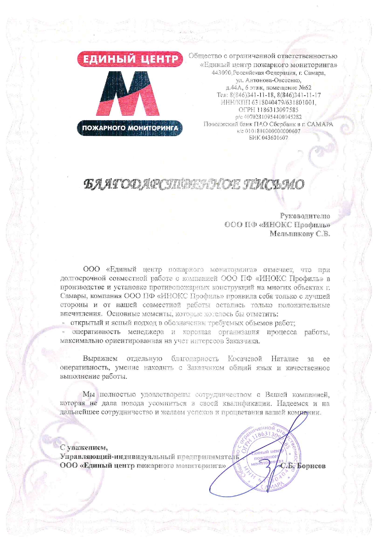 ООО «Единый центр пожарного мониторинга» отмечает, что при долгосрочной совместной работе с компанией ООО ПФ «ИНОКС Профиль» в производстве и установке противопожарных конструкций на многих объектах г. Самары ООО ПФ «ИНОКС Профиль» проявила себя только с лучшей стороны и от нашей совместной работы остались только положительные впечатления.