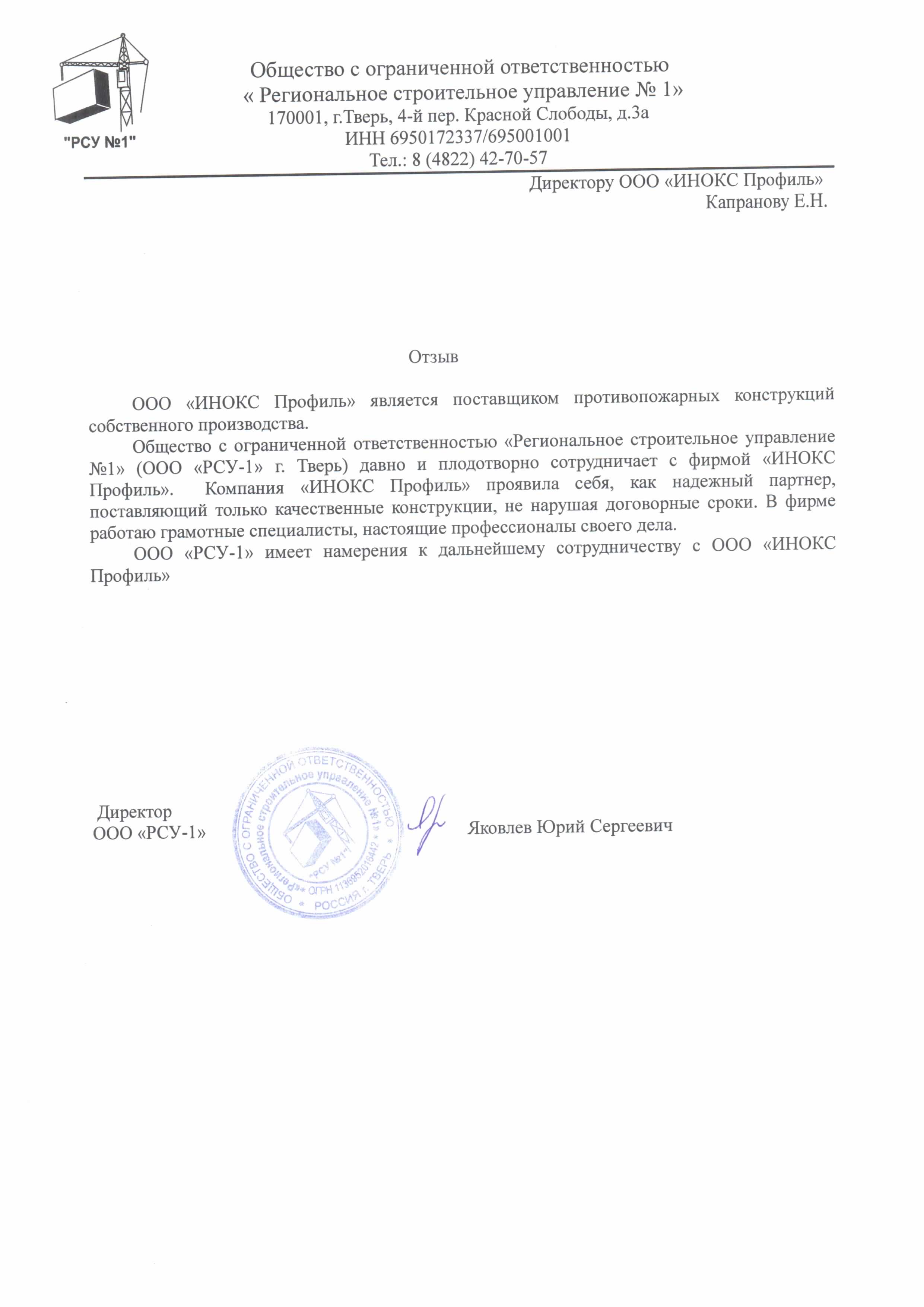 Общество с ограниченной ответственностью «Региональное строительное управление №1» (ООО «РСУ-1» г. Тверь) давно и плодотворно сотрудничает с фирмой «ИНОКС Профиль».