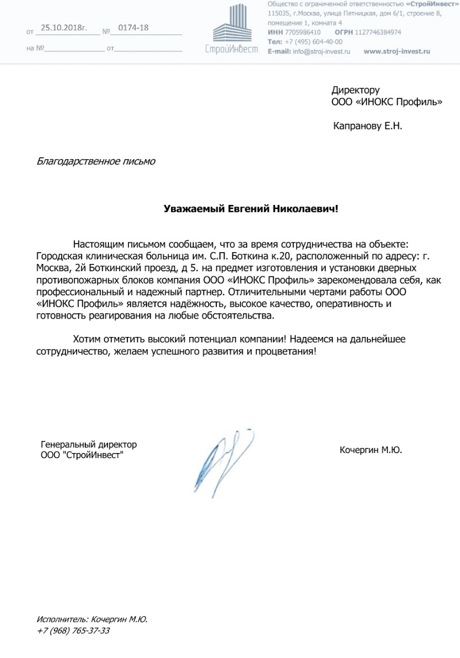 Настоящим письмом сообщаем, что за время сотрудничества на объекте: «Городская клиническая больница им. С.П. Боткина к.20», расположенный по адресу: г. Москва, 2й Боткинский проезд, д 5. на предмет изготовления и установки дверных противопожарных блоков компания ООО «ИНОКС Профиль» зарекомендовала себя, как профессиональный и надежный партнер. Отличительными чертами работы ООО «ИНОКС Профиль» является надёжность, высокое качество, оперативность и готовность реагирования на любые обстоятельства.