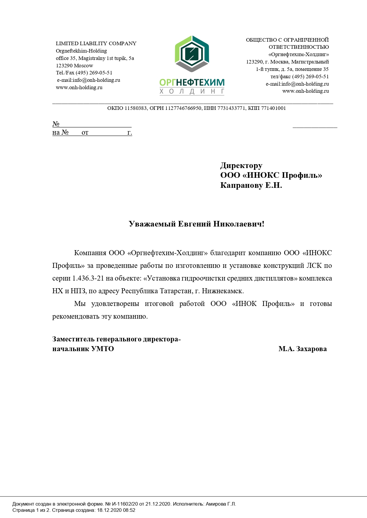 Компания ООО «Оргнефтехим-Холдинг» благодарит компанию ООО «ИНОКС Профиль» за проведенные работы по изготовлению и установке конструкций ЛСК по серии 1.436.3-21 на объекте: «Установка гидроочистки средних дистиллятов» комплекса НХ и НПЗ, по адресу: Республика Татарстан, г. Нижнекамск.