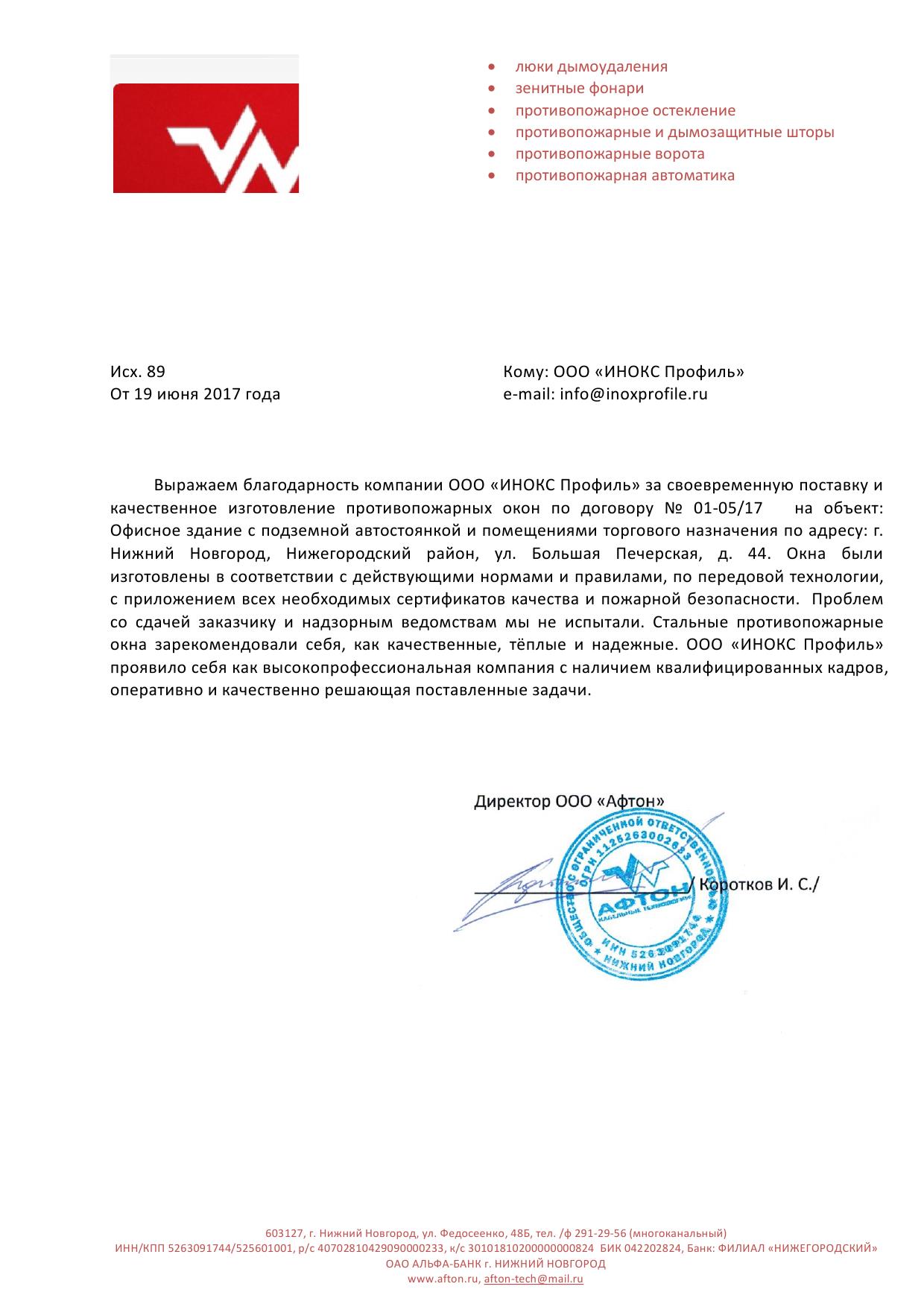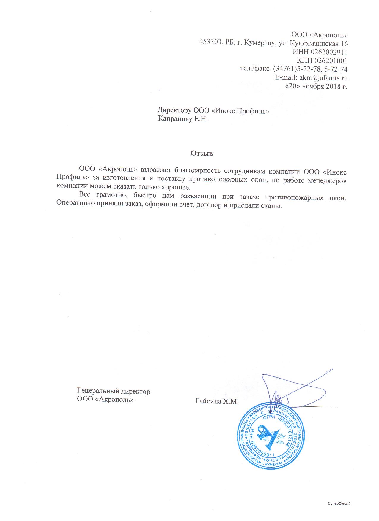 ООО «Акрополь» выражает благодарность сотрудникам компании ООО «Инокс Профиль» за изготовления и поставку противопожарных окон, по работе менеджеров компании можем сказать только хорошее.