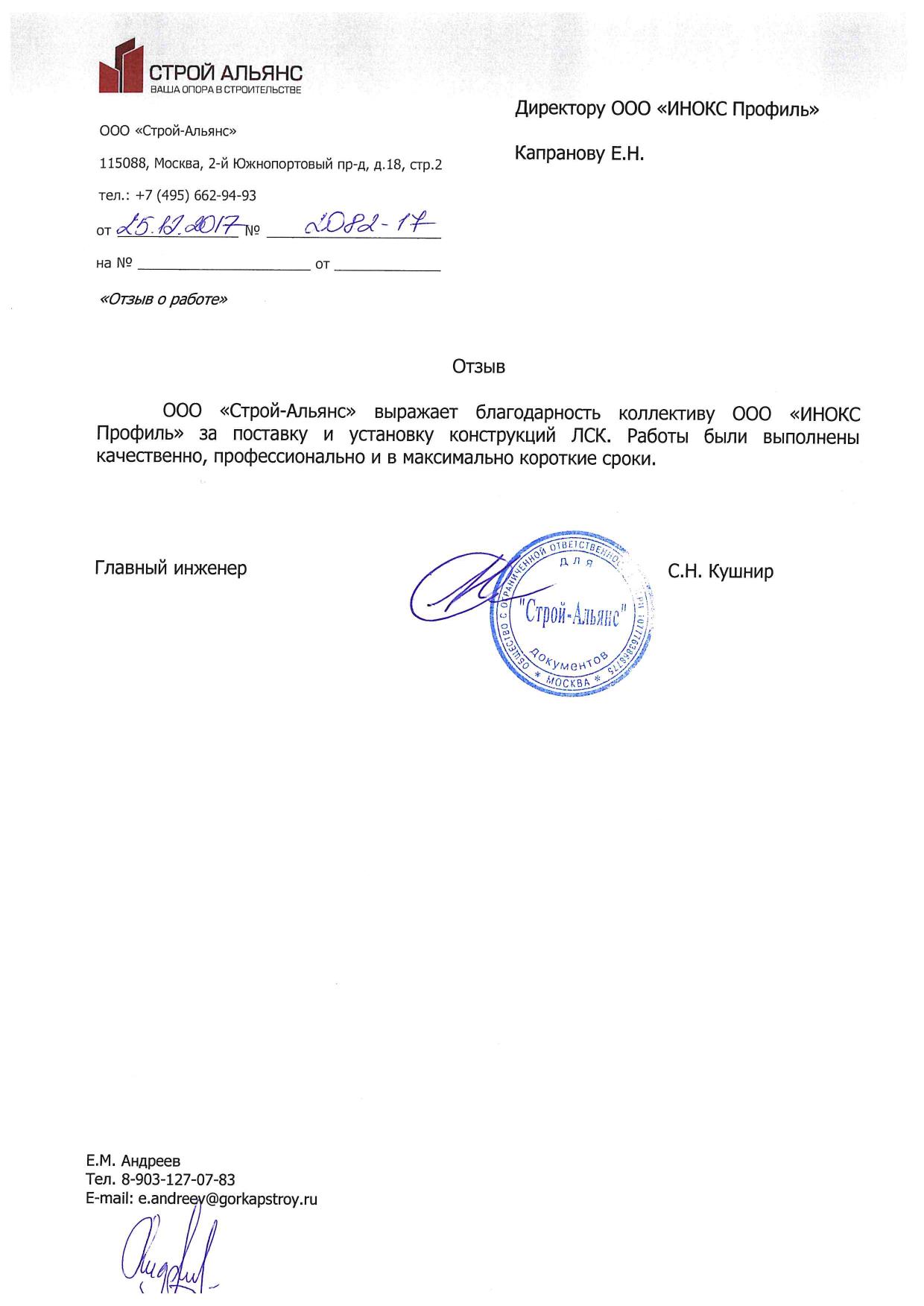 ООО «Строй-Альянс» выражает благодарность коллективу ООО «ИНОКС Профиль» за поставку и установку конструкций ЛСК. Работы были выполнены качественно, профессионально и в максимально короткие сроки.