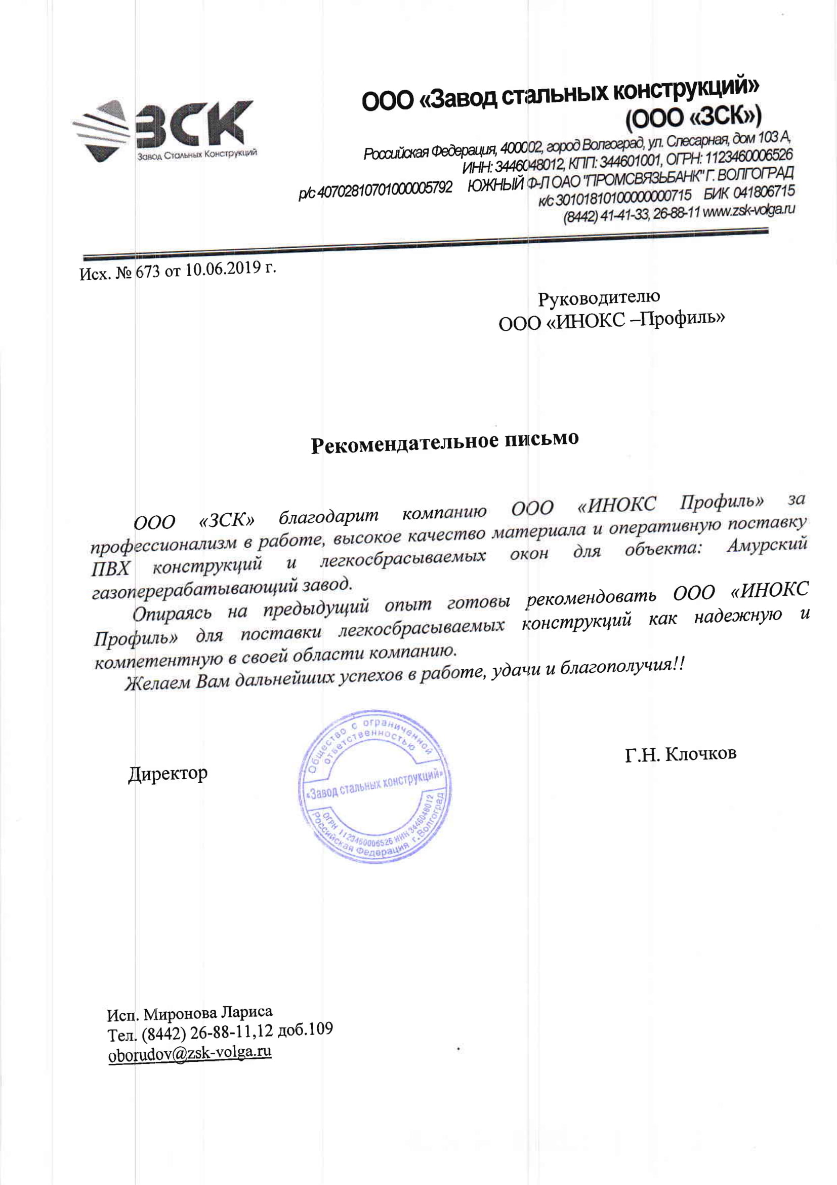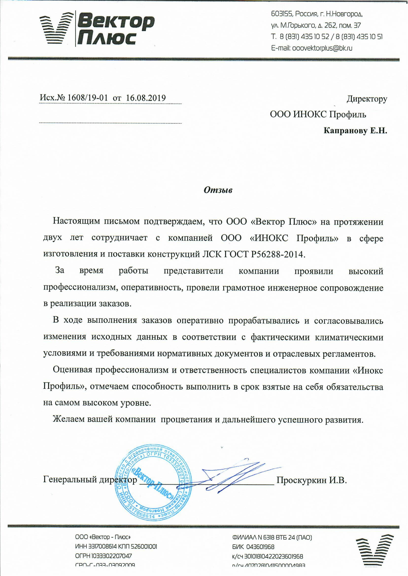 Настоящим письмом подтверждаем, что ООО «Вектор Плюс» на протяжении двух лет сотрудничает с компанией ООО «ИНОКС Профиль» в сфере изготовления и поставки конструкций ЛСК ГОСТ Р56288-2014. За время работы представители компании проявили высокий профессионализм, оперативность, провели грамотное инженерное сопровождение в реализации заказов.
