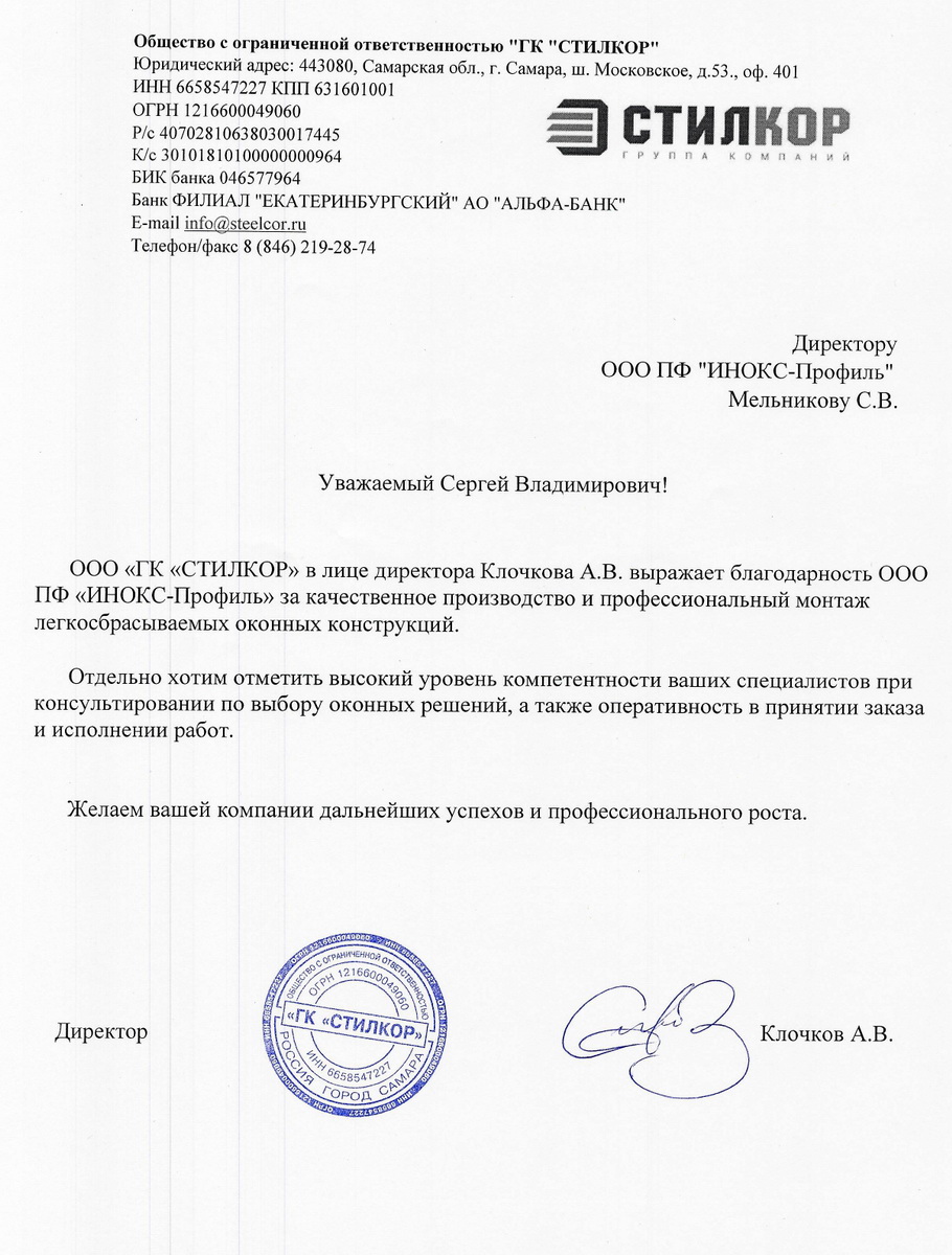 ООО "ГК "СТИЛКОР" в лице директора Клочкова А.В. выражает благодарность ООО ПФ "ИНОКС-Профиль" за качественное производство и профессиональный монтаж легкосбрасываемых оконных конструкций.