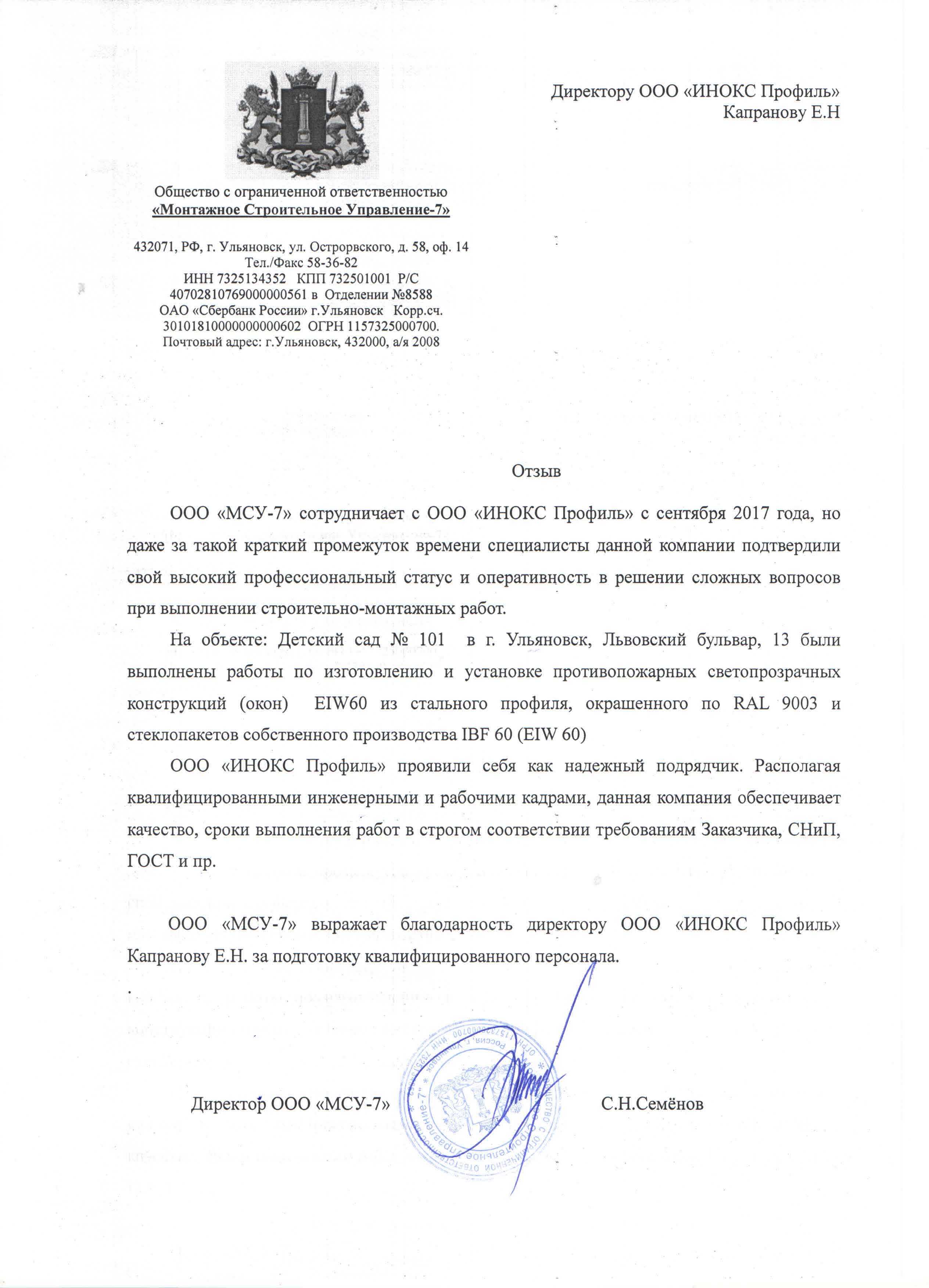 ООО «МСУ-7» выражает благодарность директору ООО «ИНОКС Профиль» Капранову Е.Н. за подготовку квалифицированного персонала.